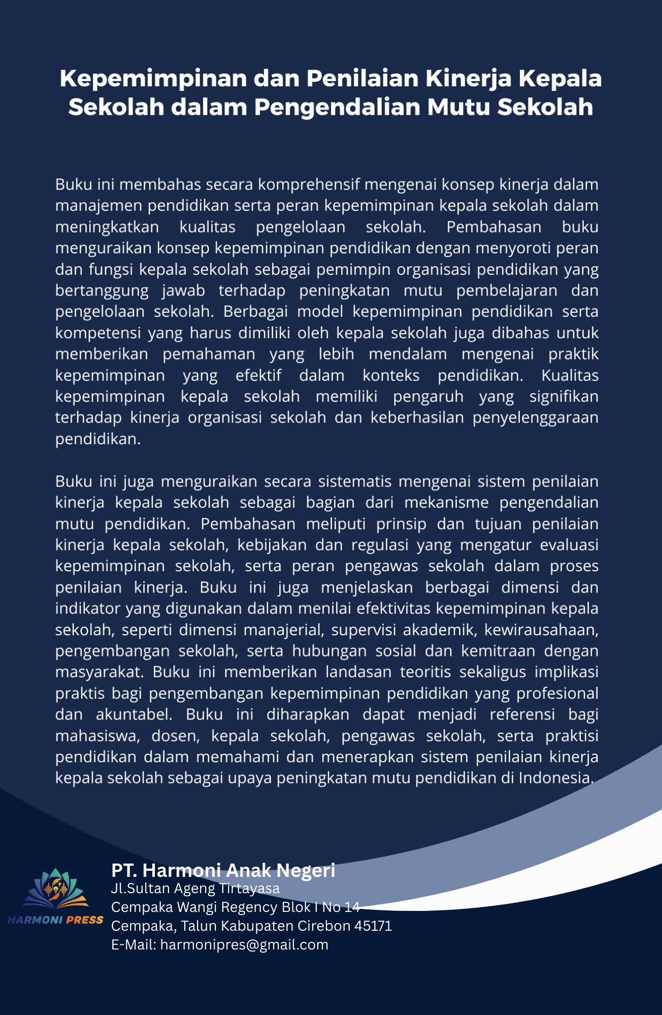 Buku ini juga menguraikan secara sistematis mengenai sistem penilaian kinerja kepala sekolah sebagai bagian dari mekanisme pengendalian mutu pendidikan. Pembahasan meliputi prinsip dan tujuan penilaian kinerja kepala sekolah, kebijakan dan regulasi yang mengatur evaluasi kepemimpinan sekolah, serta peran pengawas sekolah dalam proses penilaian kinerja. Buku ini juga menjelaskan berbagai dimensi dan indikator yang digunakan dalam menilai efektivitas kepemimpinan kepala sekolah, seperti dimensi manajerial, supervisi akademik, kewirausahaan, pengembangan sekolah, serta hubungan sosial dan kemitraan dengan masyarakat. Buku ini memberikan landasan teoritis sekaligus implikasi praktis bagi pengembangan kepemimpinan pendidikan yang profesional dan akuntabel. Buku ini diharapkan dapat menjadi referensi bagi mahasiswa, dosen, kepala sekolah, pengawas sekolah, serta praktisi pendidikan dalam memahami dan menerapkan sistem penilaian kinerja kepala sekolah sebagai upaya peningkatan mutu pendidikan di Indonesia.